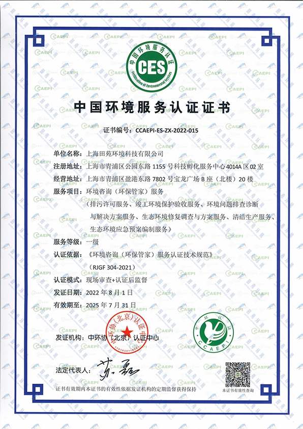 《中國(guó)環(huán)境服務(wù)認(rèn)證證書【環(huán)保管家一級(jí)】》